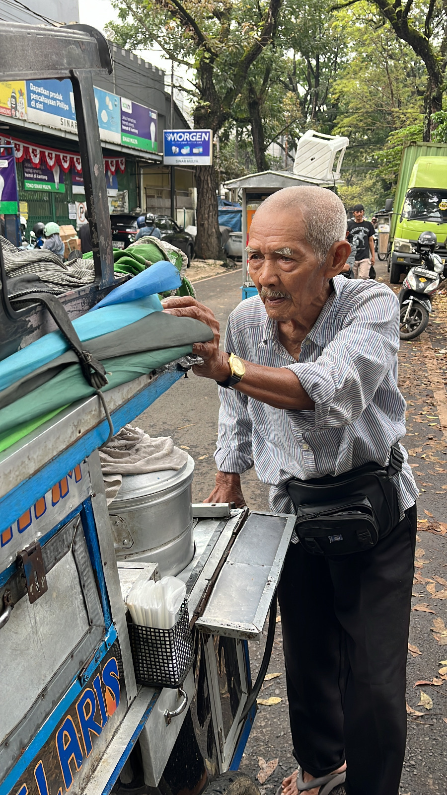 Setiap hari, dari pagi hingga malam pukul 7, beliau berkeliling kota sambil mendorong gerobak bakso ayam sejauh belasan kilometer. Dengan tubuh yang sudah renta, Abah tetap berjalan tanpa mengeluh, meski hasilnya hanya 15ribu rupiah per hari.